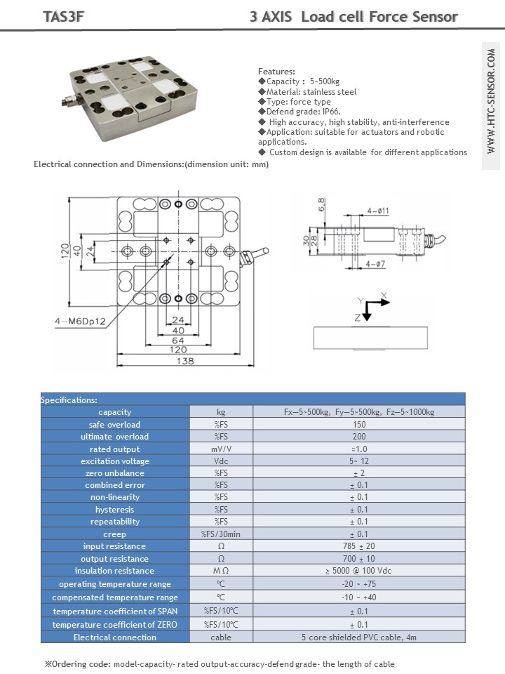 Product description:Features: ◆Capacity :5kg~200kg ◆Material: Aluminum alloy/ Stainless steel ◆Defend grade: IP67. ◆ High accuracy, high stability, anti-interference ◆Application:. It is suitable for multi direction force measuring system, (X/Y/Z) 3 direction independent (full) bridge, such as actuators and robotic applications ◆ Custom design is available for different applications